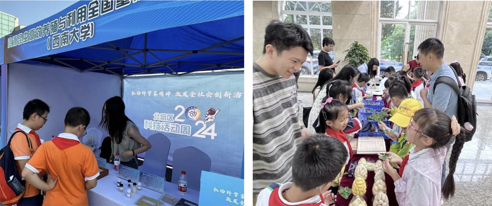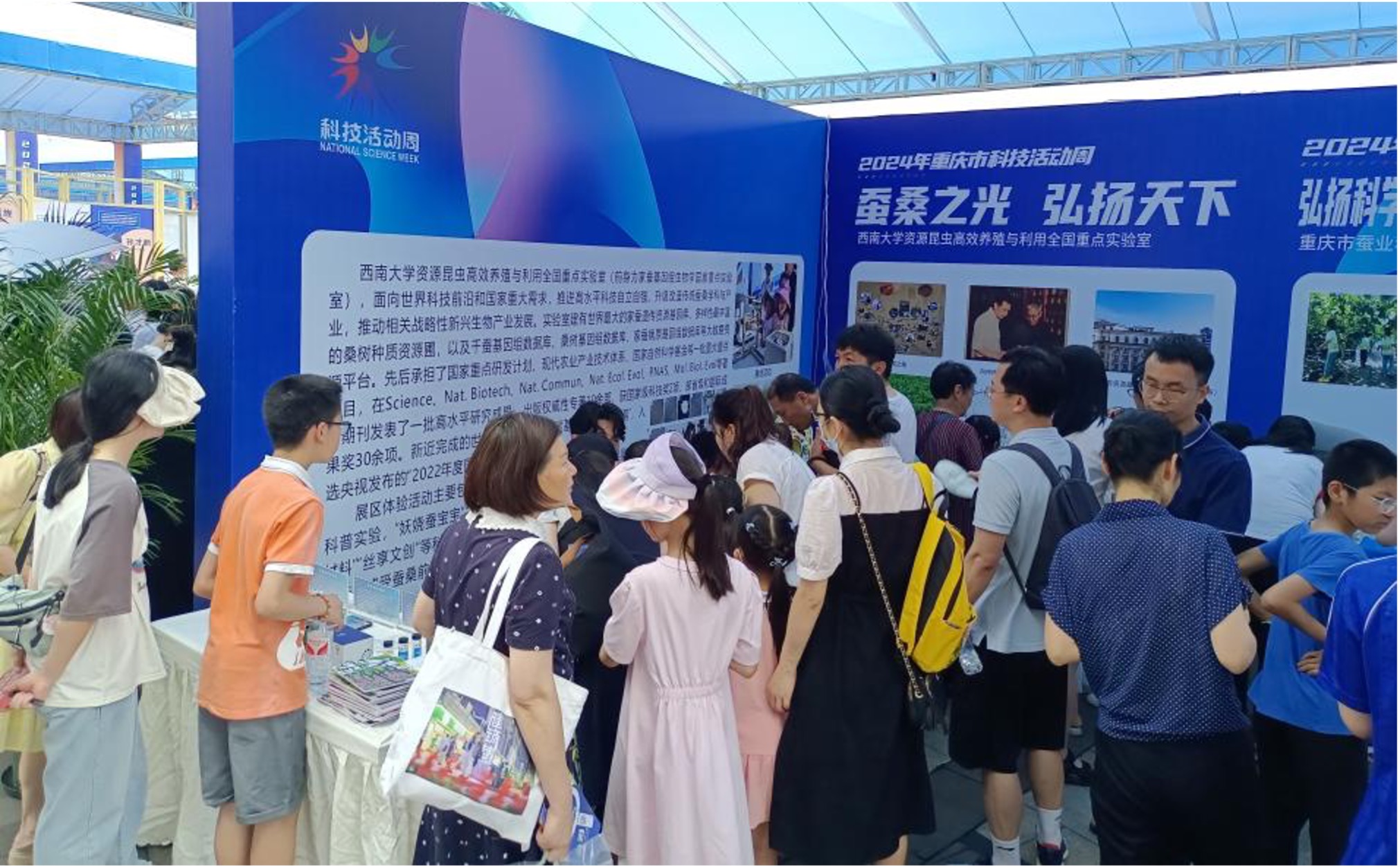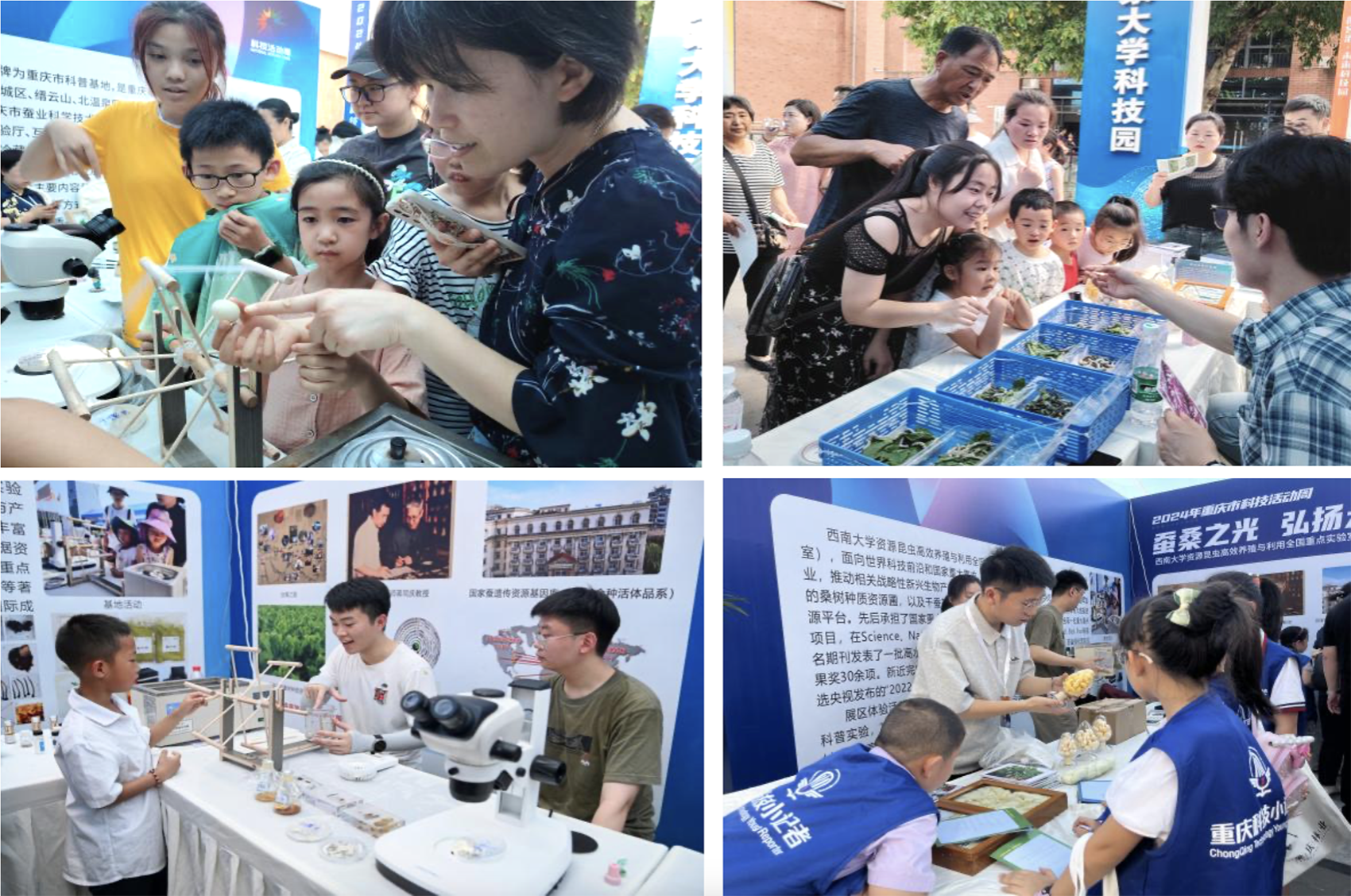 2024年5月25至27日,为深入贯彻落实习近平总书记关于科普工作的重要指示精神,积极普及科学技术知识,弘扬科学精神,传播科学思想,提升全民素质,营造崇尚科学风尚,重庆市2024年科技活动周以“弘扬科学家精神 激发全社会创新活力”为主题在创客港·未来科技园举行科普宣传主场活动。资源昆虫高效养殖与利用全国重点实验室在主场开展了主题为“蚕桑之光,弘扬天下”的科普活动。