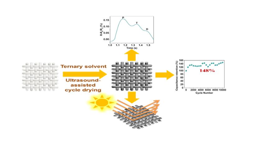 基于上述问题和分析,best365英国在线体育官网代方银教授团队研究人员将蚕丝织物用三元溶剂预处理,然后采用超声辅助循环干燥法直接制备了具有柔性超级电容器和传感器应用潜力的低成本、环保型、高性能还原氧化石墨烯丝织物电极(RGO-蚕丝织物)。
