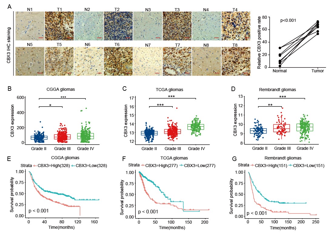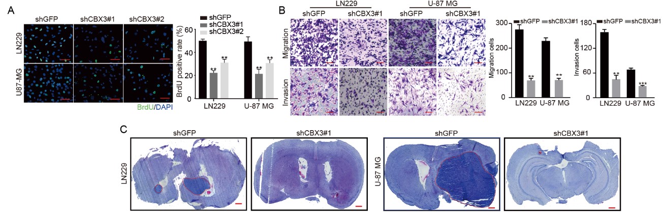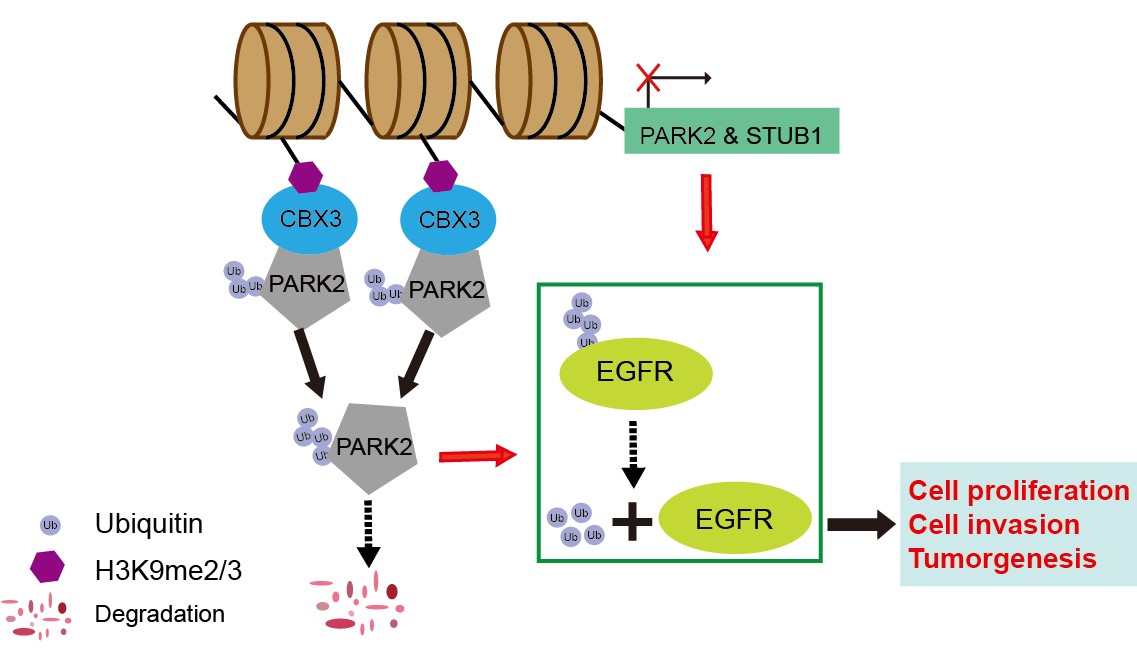 崔红娟教授团队就GBM标志物的筛查、鉴定以及如何管控EGFR在GBM的表达开展了深入研究。首先, GBM患者组织的免疫组化病理检测以及生物信息学分析发现一种能够参与异染色质形成的H3组蛋白甲基化阅读器CBX3(Chromobox 3)在GBM患者中异常高表达,并且与GBM的预后和恶性分级密切相关。功能检测表明了CBX3 在体外和体内显著促进 GBM 细胞的增殖、侵袭和肿瘤发生。从机制上来说,我们通过Ch-IP和Co-IP等一系列生物技术实验证明了CBX3促进GBM 的恶性进展是EGFR 依赖性的,并且进一步揭示了GBM患者发病机理的一条全新的信号通路CBX3-PARK2/STUB1-EGFR。该研究不仅丰富了GBM表观遗传学的研究,也为该信号通路作为GBM潜在治疗靶点的可行性提供了坚实的依据。best365英国在线体育官网2020级博士研究生彭文为第一作者,崔红娟教授为该论文的通讯作者。该研究得到了重庆市自然科学基金和重庆市博士生科研创新项目的支持。