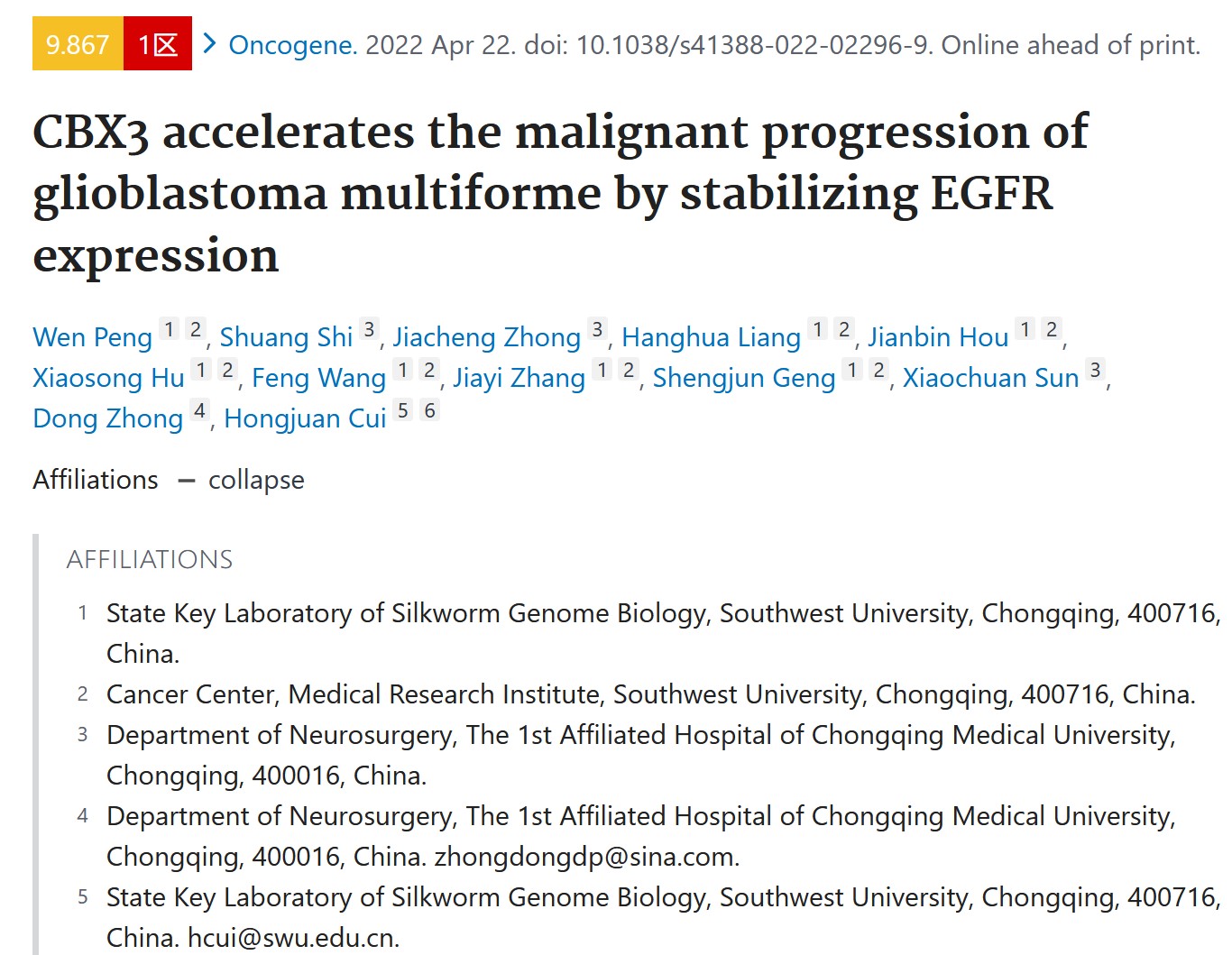 近日, ONCOGENE杂志发表了来自best365英国在线体育官网家蚕基因组国家重点实验室崔红娟教授团队题为“CBX3 accelerates the malignant progression of glioblastoma multiforme by stabilizing EGFR expression”的最新成果。