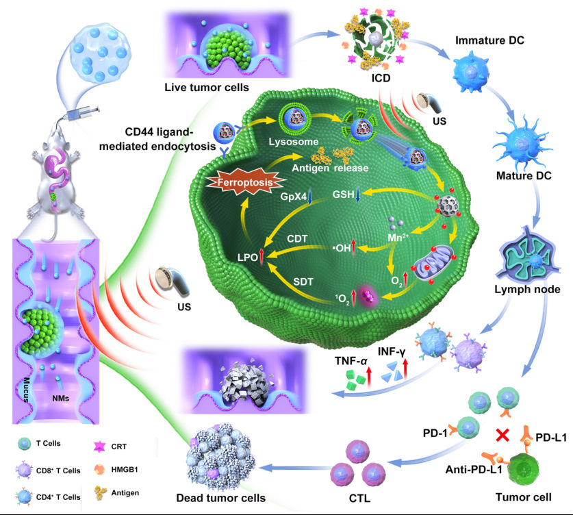免疫治疗开创了恶性肿瘤治疗的新格局,但是结肠癌免疫抑制微环境严重制约了其治疗效果。口服药物递送是最常见的临床给药途径,然而药物经口服后需克服多重递送屏障。如何实现口服药物高效递送以及克服结肠癌免疫抑制微环境已成为重大挑战。研究团队构建了丝素蛋白和硫酸软骨素共修饰的载药介孔二氧化锰,并利用壳聚糖和海藻酸钠水凝胶包裹纳米载药马达(CS-ID@NMs)构建口服药物递送系统。经口服后,水凝胶于结肠部位崩解并释放纳米马达。该纳米马达在超声和结肠癌微环境ROS的双重驱动下,成功穿越黏液并渗透到肿瘤组织深部。不仅如此,超声还可帮助纳米马达实现溶酶体逃逸,并在肿瘤细胞胞内微环境刺激下特异性释放线粒体靶向声敏剂。所释放的二价锰通过芬顿反应产生大量羟基自由基,催化过氧化氢产生氧气克服肿瘤乏氧,提高超声动力学效率,促进肿瘤脂质过氧化,加速肿瘤细胞铁死亡,促使释放肿瘤抗原,联合Anti-PD-L1,逆转免疫抑制微环境,从而有效抑制了原位结肠癌和转移结肠癌。该项研究成果于2022年8月发表在纳米微米领域重要期刊Small(IF = 15.1),硕士生曹银贵为论文第一作者。