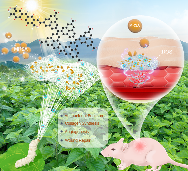 烧伤和创伤等伤口常常容易遭受细菌感染,从而引起败血症、急性肾衰竭和其他感染相关的并发症。耐药性细菌的出现进一步加剧了它们的威胁,耐甲氧西林金黄色葡萄球菌(MRSA)是最为常见的耐药性病原菌。针对传统光抗菌材料在黑暗条件下丧失抗菌功能的问题,研究团队以绿色、天然的家蚕平板丝为基底材料,利用蒽醌类有机光敏剂与石墨相氮化碳之间的协同效应,开发出一款高效、全天候杀灭细菌的平板丝抗菌敷料。该敷料不仅具有良好生物相容性、高效抗菌活性,同时解决了传统无机光敏材料如二氧化钛等与有机高分子载体之间结合力弱的问题。更为重要的是,该敷料类似于有“可充放电太阳能电池”,利用有机光敏剂的特定结构,在光照激发条件下发生分子结构重排,将抗菌活性存储起来,并在黑暗条件下缓慢释放活性氧,破坏细菌膜结构,达到持续抑制细菌的目的。该研究以绿色、环保的家蚕平板丝为基底载体,实行光敏剂的功能化后,在光照下产生大量活性氧,能有效杀灭细菌,并具有促进胶原蛋白合成、血管再生和创伤修复的功能。不仅如此,该敷料具有优异的生物安全性,在感染创伤修复方面展现了良好的应用前景。该项研究成果于2022年8月发表在生物材料领域重要期刊Advanced Healthcare Materials(IF = 11.0),易世雄副教授为论文第一作者,硕士生周鹰为论文第二作者。