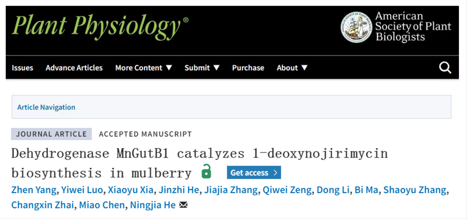 2023年2月4日,植物领域国际Top期刊Plant Physiology在线发表了家蚕基因组生物学国家重点实验室桑树研究团队题为“Dehydrogenase MnGutB1 catalyzes 1-deoxynojirimycin biosynthesis in mulberry”的研究成果,该研究揭示了由脱氢酶MnGutB1参与催化的糖衍生DNJ生物合成分子机制,是桑树DNJ合成机理解析的重大进展。