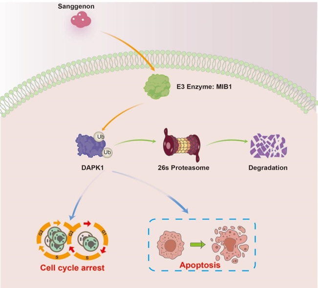 研究人员利用高通量与高内涵技术筛选发现桑根酮C(Sanggenon C)具有显著的抗癌活性。桑根酮C是桑白皮的天然类黄酮提取物,具有多种重要的的生物学特性和药效学价值。在本研究中,研究人员通过观察桑根酮C对肿瘤细胞的生长、增殖、周期、凋亡、自噬等细胞生物学行为的影响证实了其在体内外均表现出较强的肿瘤抑制作用。同时,利用实时荧光定量PCR和WB等技术对相关基因和信号通路进行检测。通过转录组、蛋白组和泛素组等组学方法,对桑根酮C处理前后差异表达基因、蛋白和代谢产物进行系统分析,筛选发现桑根酮C通过减少Death Associated Protein Kinase 1(DAPK1)的泛素化降解来增加DAPK1的蛋白表达,DAPK1是细胞死亡和增殖的关键调控因子。定量蛋白质组学和蛋白印迹分析显示,桑根酮C通过降低E3泛素连接酶Mindbomb 1(MIB1)的表达,从而增强了DAPK1蛋白的稳定性(图1)。此外,桑根酮C对肿瘤细胞增殖和凋亡的影响分别被下调DAPK1或过表达MIB1部分逆转。 这些结果表明,桑根酮C可能通过降低MIB1介导的DAPK1降解来抑制细胞增殖,诱导细胞凋亡。