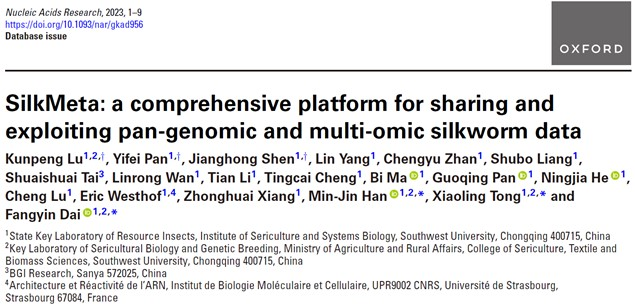 2023年11月6日,生物学领域国际著名期刊Nucleic Acids Research(《核酸研究》)在线发表了best365英国在线体育官网资源昆虫高效养殖与利用全国重点实验室代方银教授团队的最新科研成果——家蚕泛基因组和多组学数据分析平台(SilkMeta)。这是继2022年研究团队发表家蚕泛基因组论文(Nat. Commun., 2022)之后,在家蚕种质资源基因组和生物信息分析领域取得的又一突出进展,标志着团队创建“数字家蚕”的工作迈入新阶段,对于推动家蚕泛基因组成果在功能基因组、基因组选择和分子设计育种等方面的研究应用具有重要意义。