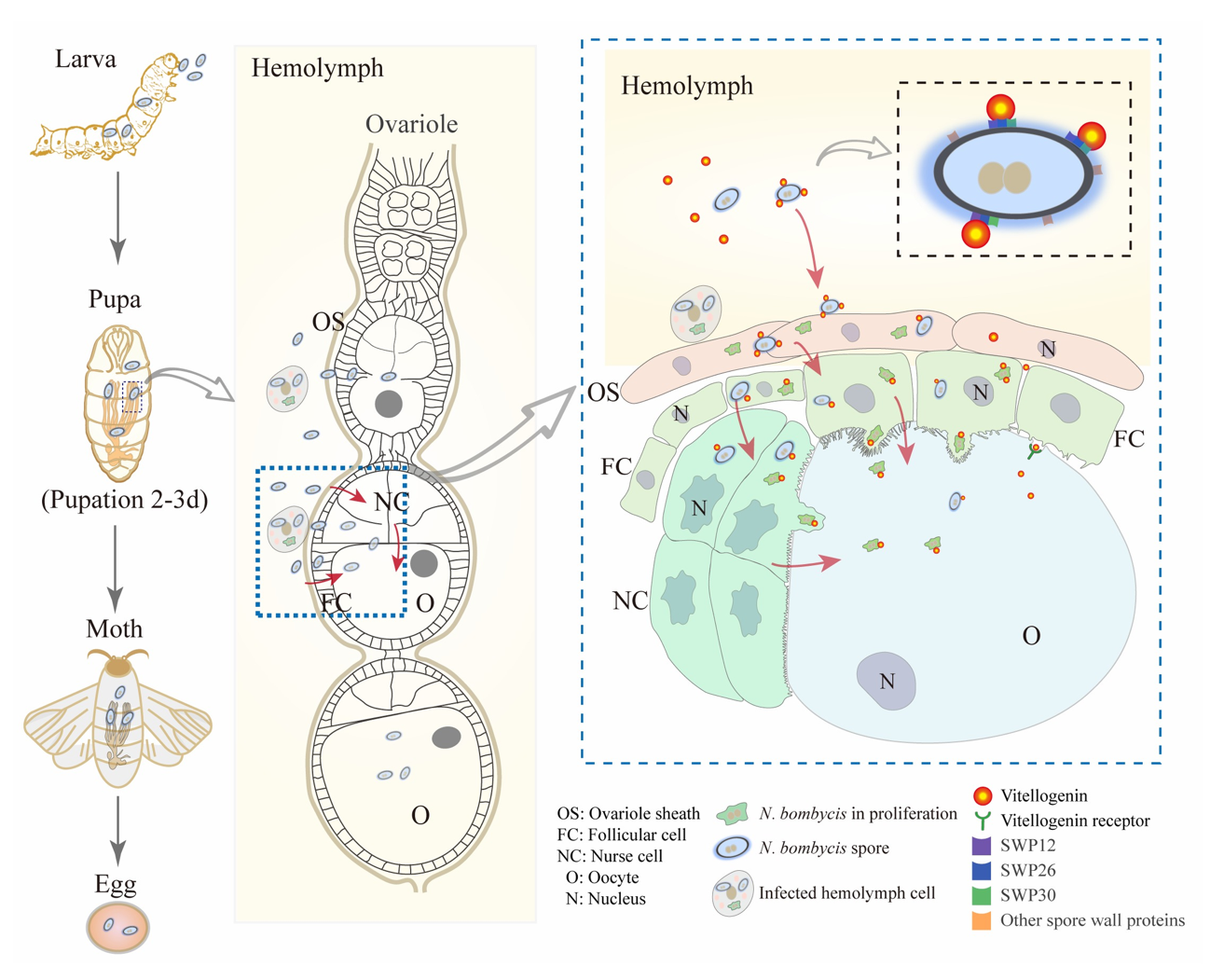 研究发现,在蛹期3天卵巢管突破卵巢膜游离于血淋巴中时,家蚕微粒子虫开始侵染卵巢管。此时,血淋巴中的病原与卵管表面黏附,从而侵入卵管鞘细胞并在其中增殖,继而侵入紧邻的滤泡细胞。自此,病原可通过以下两条路径侵入卵母细胞:(1)在滤泡细胞中增殖后,直接侵入卵母细胞;(2)从滤泡细胞先侵入滋养细胞,增殖后再侵入卵母细胞。对感染的滤泡细胞和滋养细胞进行超微观察,发现细胞结构发生重要变化:两种细胞与卵母细胞间的间隙变窄或消失,并且两种细胞中均发现包含有病原体的大囊泡结构突入卵母细胞中。进一步分析发现,病原侵染卵巢管的时间与家蚕卵黄原蛋白(BmVg)的高量表达同步,而且病原在侵染过程中其表面均结合有家蚕卵黄原蛋白;后续实验证实家蚕卵黄原蛋白可与病原表面的多种蛋白(SWP)结合;敲降家蚕卵黄原蛋白表达,以及利用抗体封闭家蚕卵黄原蛋白与病原表面蛋白的结合,发现卵巢管和子代卵粒的感染量均显著降低,表明家蚕卵黄原蛋白与病原表面蛋白的结合是介导该病原垂直传播的关键。进一步分析表明,家蚕卵黄原蛋白的VWD和DUF结构域是介导其与病原表面蛋白结合的关键区域。