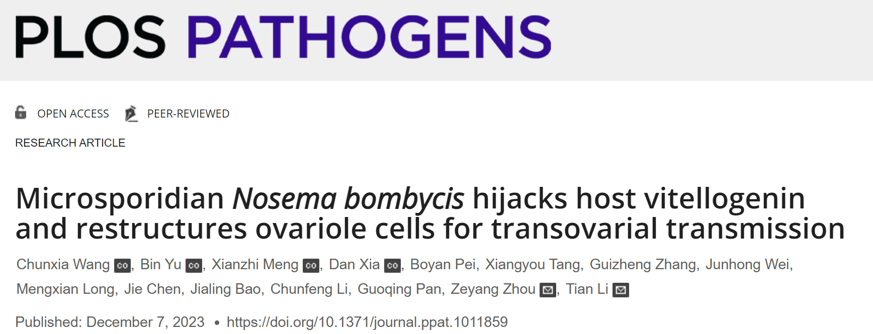 近日,实验室李田研究员课题组在微生物学Top期刊PLoS Pathogens在线发表了题为“Microsporidian Nosema bombycis hijacks host vitellogenin and restructures ovariole cells for transovarial transmission”的研究论文,揭示了家蚕微粒子虫侵入家蚕卵母细胞的时间、路径、形态、策略和关键分子机制。