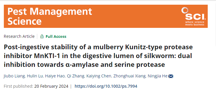 2024年2月20日,best365英国在线体育官网资源昆虫高效养殖与利用全国重点实验室何宁佳教授团队在中科院1区TOP期刊Pest Management Science上发表题为“Postingestive stability of a mulberry Kunitz-type protease inhibitor MnKTI-1 in the digestive lumen of silkworm: Dual inhibition towards α-amylase and serine protease”的研究论文。