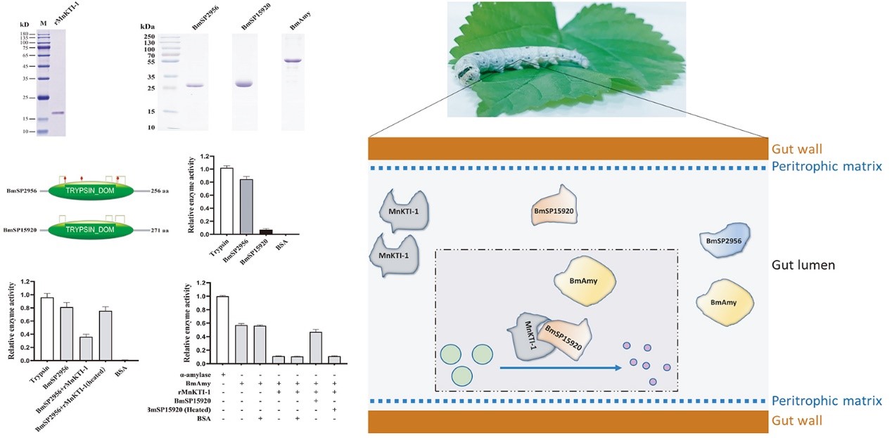桑树Kunitz类型的蛋白酶抑制子MnKTI-1能够迅速而强烈地响应食桑昆虫家蚕、桑螟、桑尺蠖和叶甲的取食。不仅如此,MnKTI-1能够抵御家蚕的消化酶的攻击,并在家蚕的肠腔中稳定存在。该研究采用体内和体外方法证明桑树Kunitz蛋白酶抑制子MnKTI-1能够与家蚕消化酶结合,并对消化液中的家蚕α-淀粉酶 BmAmy和丝氨酸蛋白酶 BmSP2956具有双重抑制活性。令人意外的是,因催化三联体缺失而失活的丝氨酸蛋白酶 BmSP15920能够逆转桑树MnKTI-1对家蚕淀粉酶BmAmy的抑制作用(图1)。据此,该研究通过研究寡食性昆虫家蚕(silkworm)如何应对其取食植物桑树(mulberry)中的蛋白酶抑制子,揭示了一种新的植食性昆虫应对植物PI(蛋白酶抑制子)的策略:昆虫利用因活性位点突变而失去酶活性的蛋白酶封阻植物中的蛋白酶抑制子。此外,在家蚕消化道中发现了多个类似BmSP15920的蛋白酶,这提示该作用模式可能是家蚕适应桑树蛋白酶抑制子的重要策略。