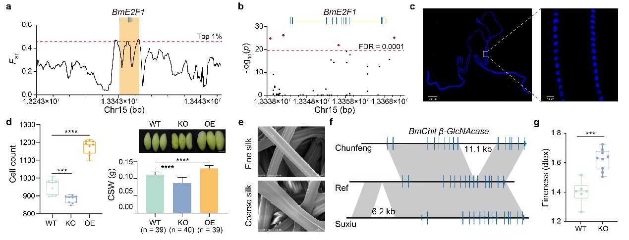 长期以来家蚕育种选择的主要目标经济性状是茧丝相关性状,如茧丝产量和品质性状。然而,迄今为止对这类属于数量遗传性状的控制基因和位点知之甚少。泛基因组可谓是连接表型特别是复杂性状和序列之间“最近的桥”。在本研究中的一个案例,从选择信号和结构变异切入,揭示了与细胞周期相关的转录因子BmE2F1调控家蚕茧丝产量。通过CRISPR-cas9敲除BmE2F1后,蚕的丝腺细胞数减少了7.68%,产丝量减少22%;在丝腺中过表达BmE2F1后,丝腺细胞数增加了23%,产丝量增加16%。另一方面,茧丝纤度是蚕丝的重要品质性状,细纤度蚕丝具有独特应用和更高的经济价值,但之前对茧丝纤度的分子遗传基础毫无所知。本研究中的另一个案例,通过分析细纤度品种基因组中存在的稀有变异,鉴定到控制茧丝纤度的基因BmChit β-GlcNAcase,该基因在细纤度品种中表达量显著提高,敲除该基因后家蚕的茧丝纤度变粗,表明该基因在茧丝纤度的决定中起关键作用。