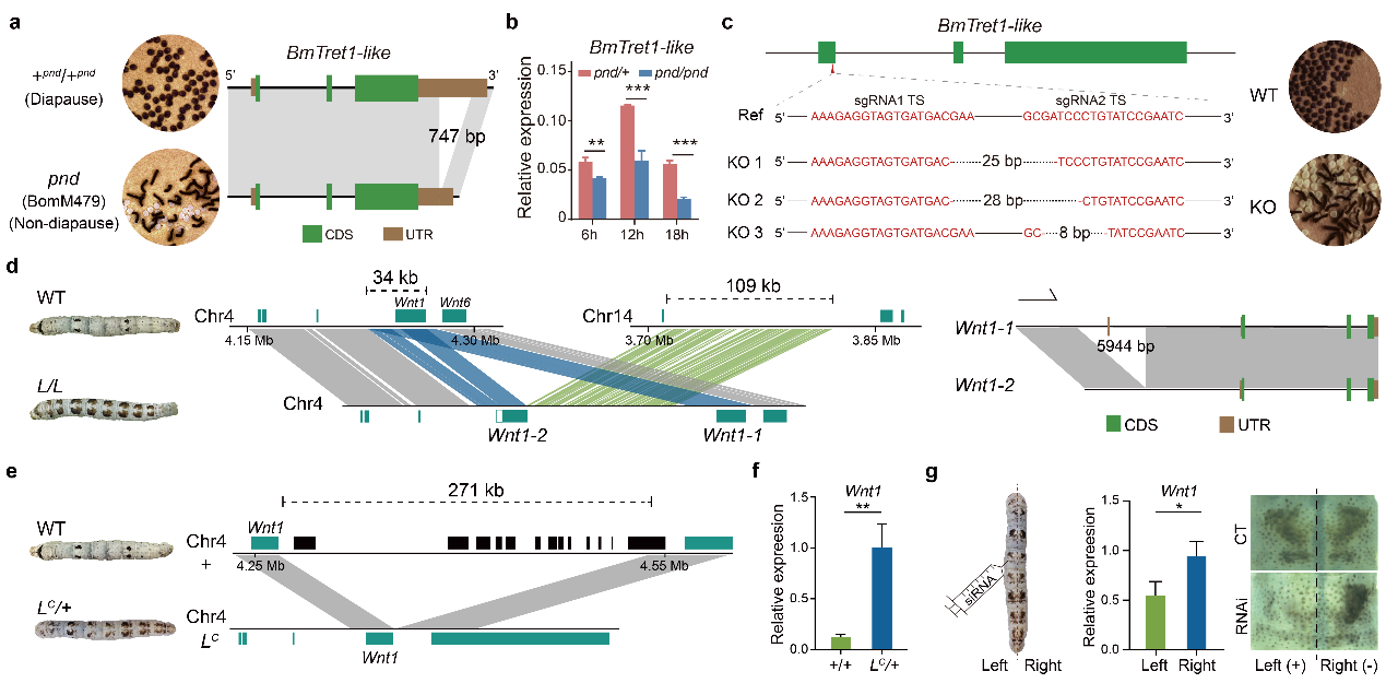 滞育是昆虫中常见的一种生态适应性性状,它能确保昆虫顺利躲过不利于生存的环境条件。虽然滞育激素早在1957年于家蚕中首次被发现(Nature, 1957),但至今关于胚胎滞育基因的信息却很少。本研究中,基于家蚕“着色非滞卵”突变体(pnd)和基因组结构变异分析,并通过基因编辑进行功能验证,揭示了BmTret1-like基因是重要的胚后滞育决定因子。这是昆虫中首次鉴定出胚后滞育决定基因。