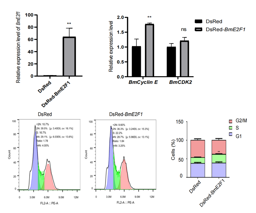 家蚕丝腺细胞的核内复制周期主要涉及G/S期的转换。因此,课题组检测了G/S期转换期间关键基因的表达,如BmCyclin E和BmCDK2等。结果显示,过表达BmE2F1后, BmCyclin E显著上调。流式细胞术实验显示过表达BmE2F1后家蚕细胞中S期的细胞比例显著增加。
