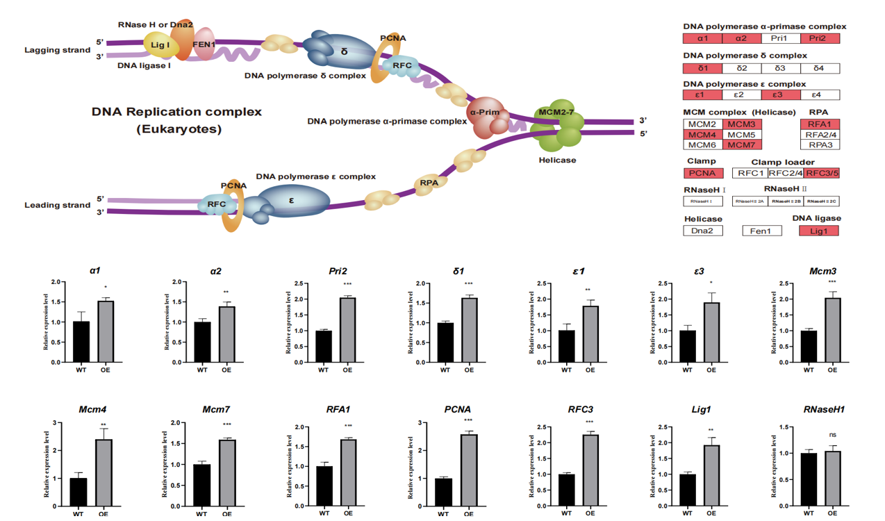 在真核细胞周期的S期,DNA复制是一个复杂的过程,涉及多种蛋白复合体的参与,包括DNA聚合酶、解旋酶、滑动夹子和加载器,以及DNA连接酶等。基于DNA复制模型和转录组数据分析,课题组发现在BmE2F1过表达后丝腺中与DNA复制相关的基因显著高表达。同时,定量实时PCR实验也证实相同的结果(图2)。
