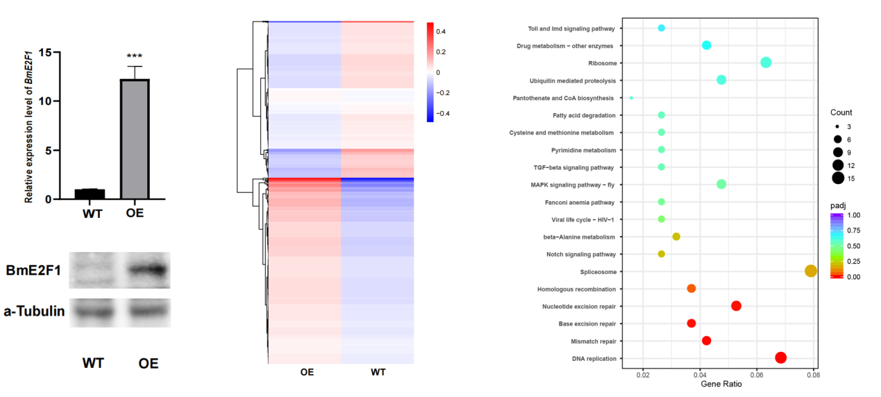 在该研究中,课题组首先采用RNA测序技术,分析了大造蚕品系和丝腺特异性过表达BmE2F1的家蚕品系的丝腺转录组。在差异表达基因中,许多与DNA复制(家蚕幼虫丝腺细胞的核内复制)相关的基因显著富集(图1)。