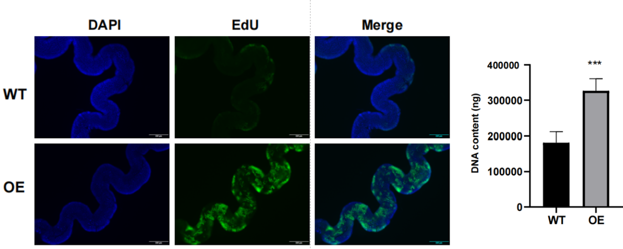 此外,该研究发现在家蚕丝腺细胞中过表达BmE2F1后,丝腺细胞DNA复制显著增强,DNA含量显著增加(图4)。