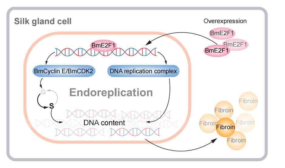 综上,BmE2F1通过两种机制调控家蚕丝腺细胞的核内复制:一是增强DNA复制复合体的形成,二是促进细胞进入S期。最终,家蚕丝腺细胞中增加的DNA含量致使家蚕茧丝产量增加(图5)。