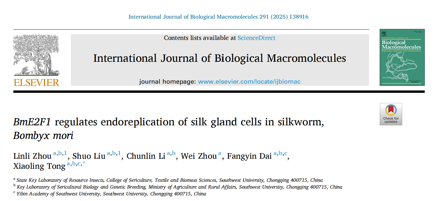 资源昆虫高效养殖与利用全国重点实验室童晓玲教授课题组前期研究发现BmE2F1能显著提升家蚕的茧丝产量(Nat. Commun,2022),但是其具体的分子机制尚不清楚。2024年12月26日,该课题组在国际学术期刊International Journal of Biological Macromolecules(中科院一区)在线发表了题为“BmE2F1 regulates endoreplication of silk gland cells in silkworm, Bombyx mori”的研究论文,该研究揭示转录因子BmE2F1通过调控丝腺细胞核内复制进而影响家蚕茧丝产量。