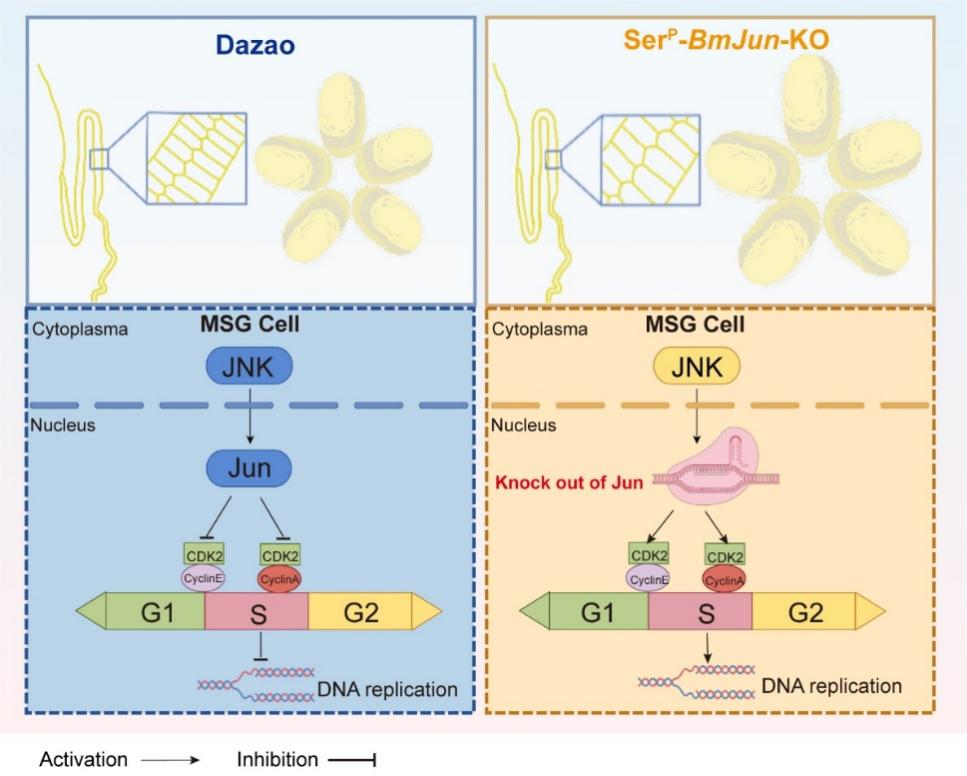 2025年7月18日,国际著名期刊Journal of Advanced Research(中科院1区TOP期刊,IF2024=13.0)在线发表了best365英国在线体育官网资源昆虫高效养殖与利用全国重点实验室潘敏慧教授课题组题为 “Bombyx mori Jun gene is involved in endoreplication of silk gland cells by regulating S-phase cell cycle genes” 的研究论文。该研究首次解析了JNK信号通路及下游关键基因BmJun在家蚕丝腺细胞核内复制中的功能和作用机制,并基于CRISPR/Cas9技术成功创制了丝腺特异性敲除BmJun基因的转基因品系,为家蚕丝腺改良与新品种的培育提供了重要素材。