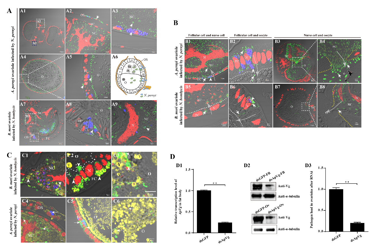 实验室微孢子虫研究团利用N. pernyi感染柞蚕,N. bombycis分别感染家蚕、棉铃虫和斜纹夜蛾,比较分析了微孢子虫经卵巢垂直传播过程和机制的保守性及差异。研究发现,两种微孢子虫侵入宿主卵母细胞的路径高度相似,均依次感染卵鞘细胞、滤泡细胞、滋养细胞,最终侵入卵母细胞。然而,两种病原的垂直传播过程存在明显差异:N. bombycis仅在卵黄发生期(卵巢管暴露于血淋巴)才能侵染卵巢管,而N. pernyi则在柞蚕蛹滞育期即可侵染卵巢管。此外,N. bombycis对卵巢管各细胞的感染率较低,且在卵母细胞和滋养细胞中均能产生成熟孢子;而N. pernyi的感染率较高,且在卵巢管各细胞中主要处于增殖状态。为深入揭示微孢子虫垂直传播的分子机制,研究团队对家蚕和柞蚕的卵黄原蛋白(vitellogenin, Vg)进行RNAi分析,发现卵巢管中的病原载量显著降低,揭示了Vg在微孢子虫垂直传播中的保守性和关键性作用。