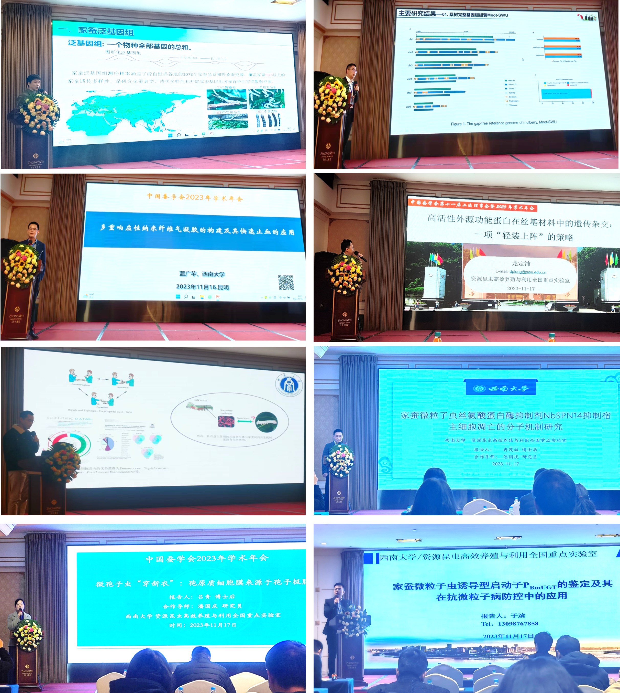 best365英国在线体育官网资源昆虫全国重点实验室及蚕桑纺织学院共有18名研究人员参加本次学术年会,包括胡永刚研究员在内,共作学术报告9个。在大会报告上,先后有陆昆鹏博士后作了题为“家蚕泛基因组和多组学数据库(SilkMeta)的构建和应用”的报告,马赑副教授作了题为“桑树完整基因组图谱构建揭示染色体结构与进化”的报告,蓝广芊教授作了题为“多重响应性蚕丝纳米纤维气凝胶的构建及其快速止血的应用”的报告;在分会场交流报告上,龙定沛副教授作了题为“高活性外源功能蛋白在丝基材料中的遗传杂交:一项‘轻装上阵’的策略”的报告,冉茂双博士后作了题为“家蚕微粒子虫丝氨酸蛋白酶抑制剂 NbSPN14 抑制宿主细胞凋亡的分子机制”的报告,李冠楠老师作了题为“共生 Bacillus subtilis对家蚕的益生机制”的报告,吕青博士后作了“‘穿新衣’-家蚕微粒子虫极膜层经极管运输后转变为孢原质膜”的报告,于滨博士后作了题为“家蚕微粒子虫诱导型启动子PBmUGT的鉴定及其在抗微粒子病中的应用”的报告。以上报告展示了本单位最新研究成果和进展动态,引起与会人员的广泛关注和讨论。