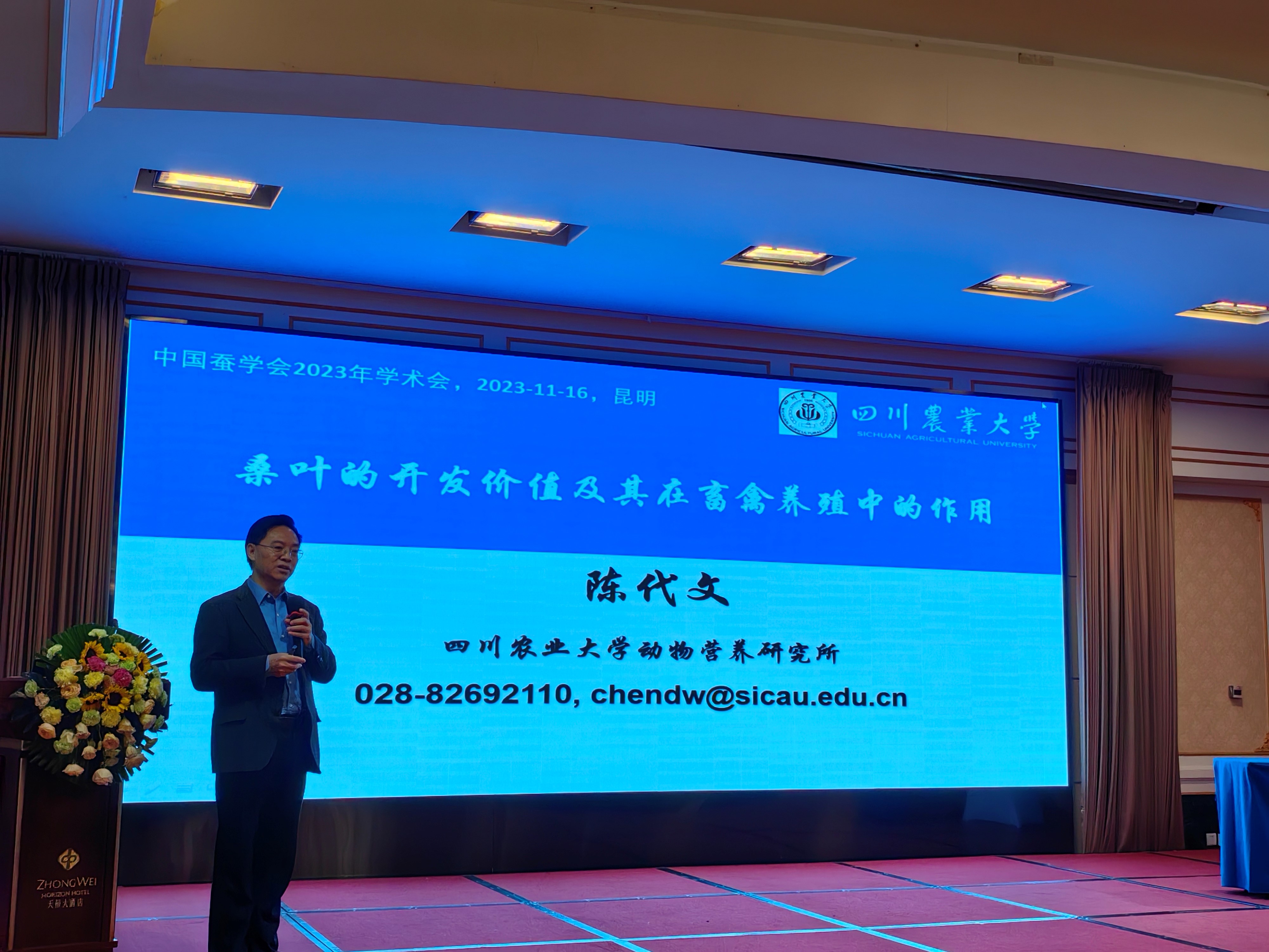 本次会议邀请四川农业大学陈代文教授和best365英国在线体育官网胡永刚研究员作特邀报告。陈代文教授以“桑叶的开发价值及其在畜禽养殖中的作用”为题,阐述了在饲料资源面临挑战的背景下,发现桑叶具有功能物质丰富、营养价值高、替抗作用突出等显著特点,完全可作为优质功能饲料开发应用。陈教授近期对桑叶饲料价值进行了科学系统的评价,以猪为试验对象取得了很好的结果。陈代文教授是动物营养与饲料科学领域的知名学者,2023年获全国创新争先奖章,他的报告为桑叶饲料开发与推广提供了重要理论依据、确凿的数据支撑,现场引起热烈反响。