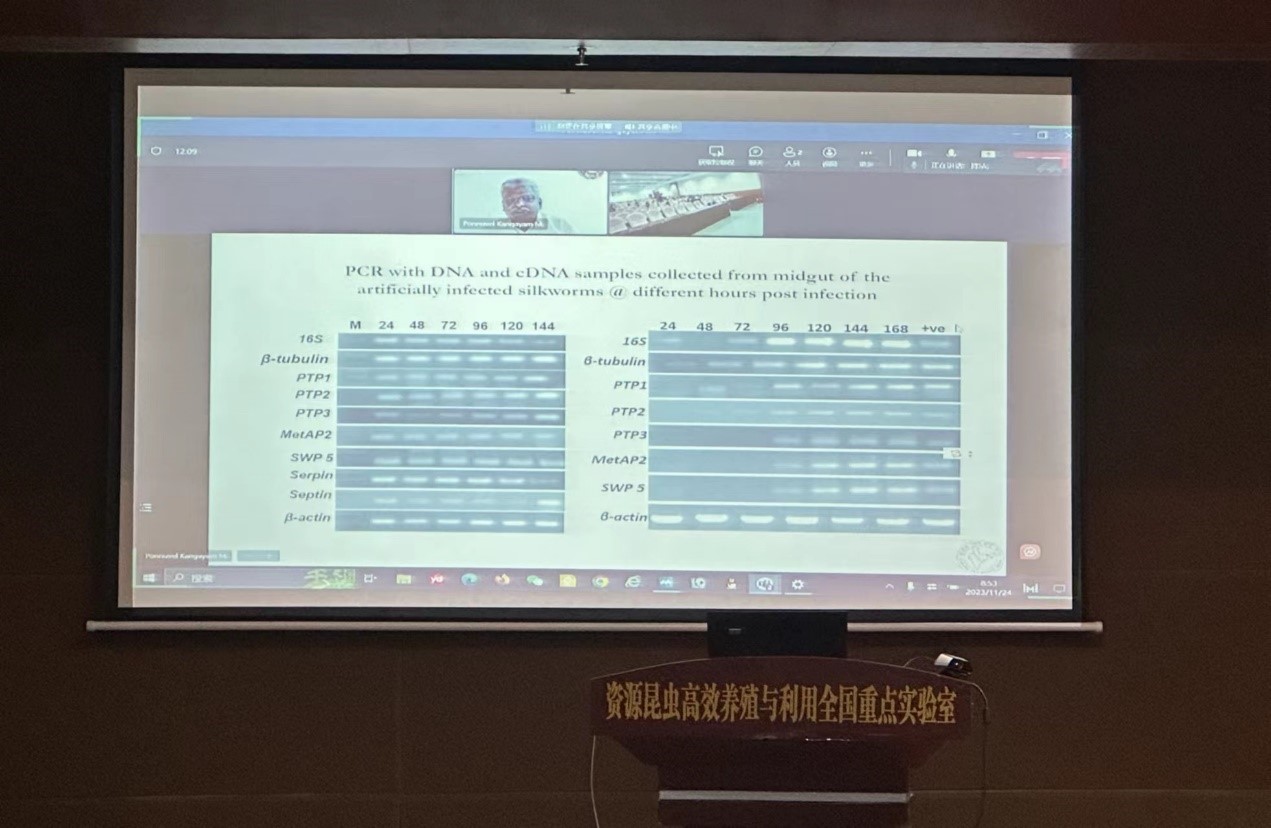 Dr. Kangayam Ponnuvel介绍了印度蚕业的概况以及研究团队在家蚕和野蚕(柞蚕等)蚕病领域的研究成果,重点探讨了蚕病毒病和微粒子虫病的检测新方法建立及应用情况。此外,他还探讨这些研究对于印度蚕桑产业的潜在影响。在场师生们积极提问并与Dr. Kangayam Ponnuvel开展互动交流,气氛热烈。此次报告为相关领域的研究生提供了非常好的学习和交流机会。Dr. Kangayam Ponnuvel表示,期待与资源昆虫全国重点实验室进一步加深合作,共同解决蚕病检测和防治的重大问题。