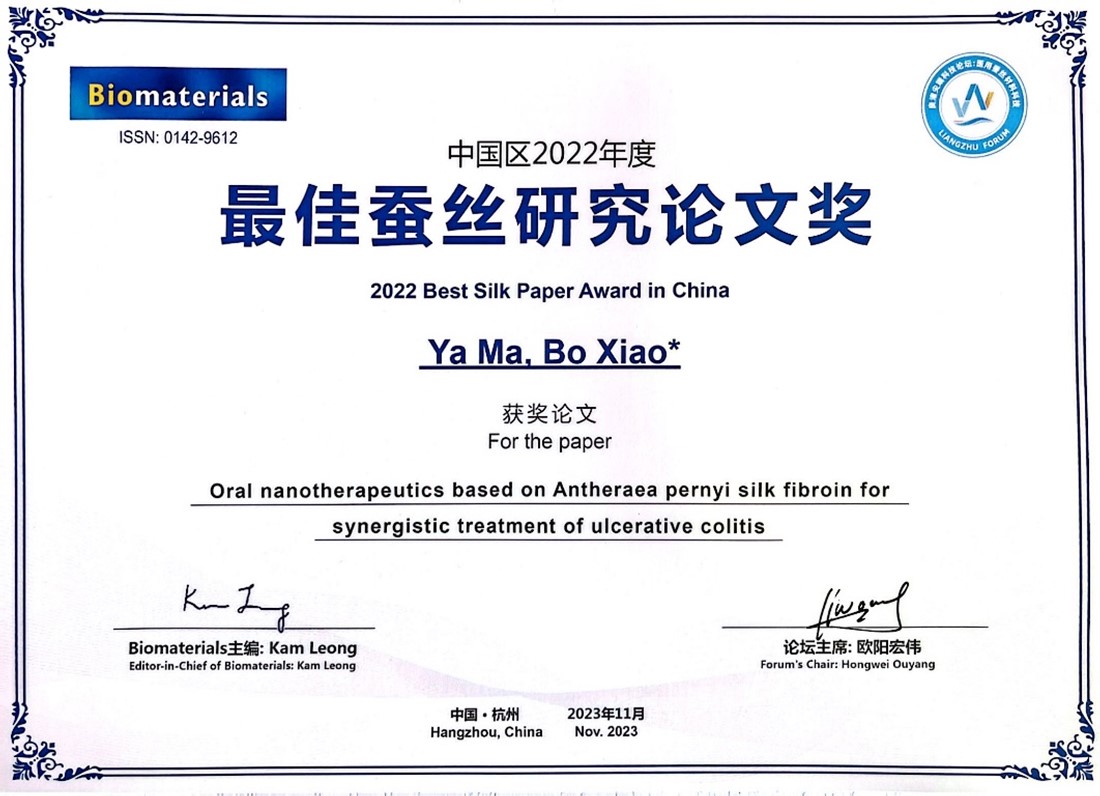近期,由浙江省组织工程与再生医学技术重点实验室联合国际生物材料领域的四大主流期刊(《Biomaterials》《Advanced Science》《Advanced Healthcare Materials》《ACS Biomaterials Science & Engineering》)主办的“2023良渚尖端科技论坛:医用蚕丝材料科技”,首度发布了中国区2022年度最佳蚕丝论文。肖波教授指导的马雅博士生的学术论文“Oral nanotherapeutics based on Antheraea pernyi silk fibroin for synergistic treatment of ulcerative colitis(ESI高被引论文)”,荣获2022年度Biomaterials中国区最佳蚕丝论文奖。据悉,本次上述4个期刊各自选出1篇最佳论文,共有4篇论文获得表彰。