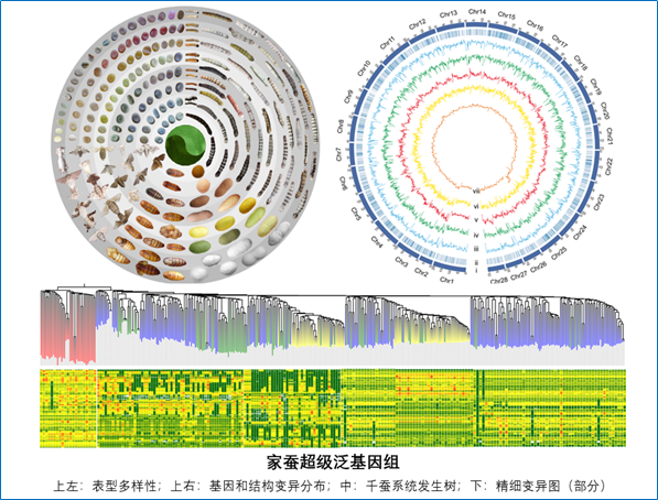 研究团队实施的大规模种质资源“千蚕基因组”计划所取得的成果包括:1)完成1078份代表全球多样性的蚕遗传资源深度重测序(平均65倍,最高181倍)、其中545份各类代表性种质的高质量三代(长读长)测序(平均97倍,最高277倍),获得55.57T的基因组大数据,率先实现家蚕基因库数字化;2)从头组装545个高质量参考基因组,对100个基因组进行了基因注释,得出家蚕泛基因总数为19411个,其中新发现家蚕基因(家族)达7308个;3)鉴定出4300余万个SNP、930余万个Indel、340余万个结构变异(SV),建立了大量结构变异与性状的联系;4)共鉴定到468个驯化相关基因和198个改良相关基因,其中新鉴定分别为264和185个,它们是育种选择的候选靶标;5)发现中国实用种和日本实用种仅共享不到3%的改良作用位点,揭示了中、日两个系统间产生强杂交优势的遗传基础奥秘;6)在深入分析群体遗传结构、系统演化关系基础上,作出了家蚕驯化起源于黄河中下游地区的重要结论;7)基于泛基因组并结合功能实验,示范性地解析了家蚕产丝量、茧丝纤度、茧色、化性及体色等重要经济和生态性状的遗传基础及其关键基因,展示了泛基因组在解析复杂性状和高效挖掘优异基因方面的强大优势,其中首次鉴定到昆虫胚后滞育决定因子和蚕丝纤度控制基因;8)最终绘制了世界首张家蚕超级泛基因组图谱,囊括了目前最全面的家蚕及野桑蚕的基因组信息,也是至今全球动植物中最大样本的长读长泛基因组,是一张高精度的家蚕基因组遗传变异图谱。该图谱如同一本精细的家蚕基因组“数字字典”,对深化功能基因组研究和推进家蚕模式化、开启家蚕设计育种等意义重大。该项成果的取得,将引领和推动蚕学研究步入高速发展阶段,强劲赋能“改造家蚕、多元利用”新工程快速发展。