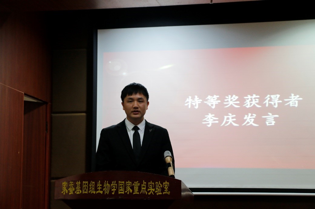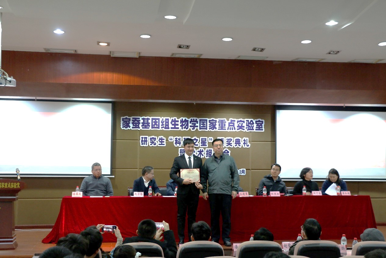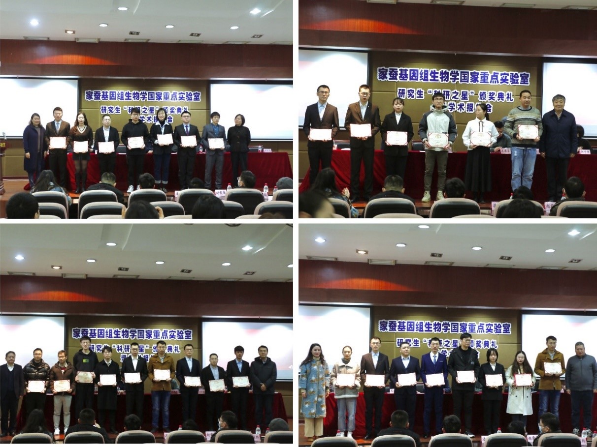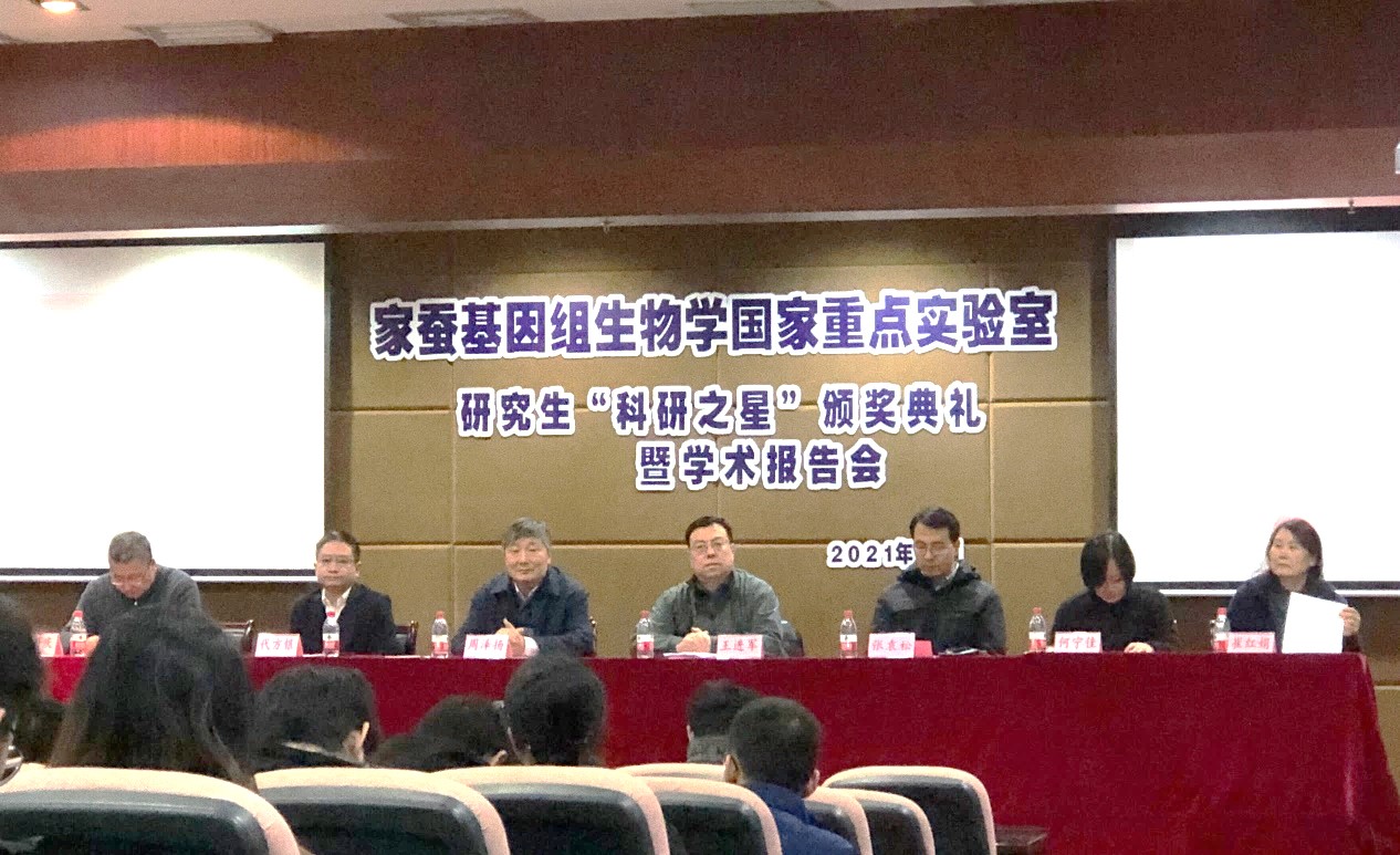 12月24日上午,家蚕基因组生物学国家重点实验室2020年度研究生“科研之星”颁奖典礼暨学术报告会在蚕学宫学术报告厅举行。学校副校长王进军,国重室学术委员会副主任周泽扬,蚕桑纺织与生物质科学学院党委书记张袁松等院领导,国重室主任、学院院长代方银,副主任何宁佳、崔红娟、潘国庆等实验室领导及指导教师和研究生代表200余人参加典礼。31名研究生受到表彰,分获特、一、二、三等奖,分享33.25万元奖金,其中特等奖奖金为5万元。