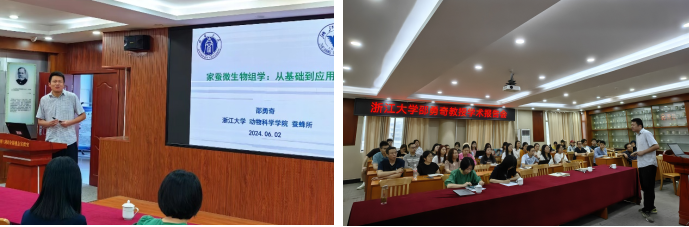 6月2日,由代方银教授邀请并主持,苏州大学蚕桑研究所所长李兵教授,浙江大学动物科学学院邵勇奇研究员,华南农业大学动物科学学院田铃教授、杨婉莹教授于best365英国在线体育官网科技楼四楼报告厅分别作学术交流报告。