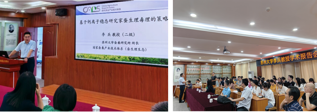 李兵教授以“基于钙离子稳态研究家蚕生理毒理的策略”为题,重点介绍了钙离子稳态与丝腺生理功能关系,阐释了结薄皮茧及变态受阻的有关机理,讲述了课题组近期在家蚕超微剂量农药中毒方面的研究进展。李教授还简要介绍了苏州大学蚕桑学科发展历史,同时分享了自己的成长经历,引起极大共情。
