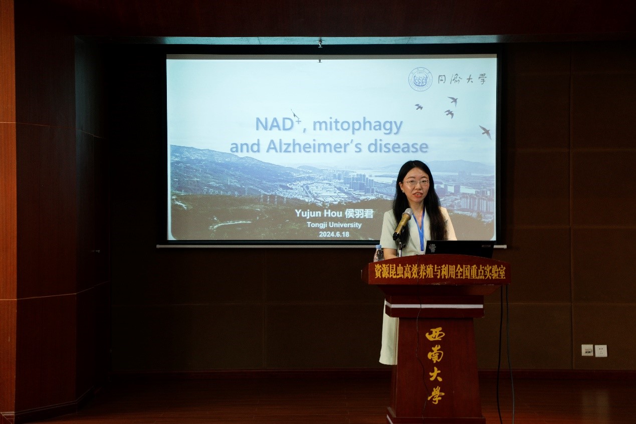 随后,实验室举行了青年学术研讨会,同济大学国家级青年人才侯羽君教授、电子科技大学孙崇奎副研究员、实验室宋江波副教授和哥本哈根大学李知泉博士分别报告了阿尔茨海默症中线粒体自噬和NAD+的作用以及尿石素对阿尔茨海默症的治疗作用、端粒维护和NAD+代谢在细胞及机体衰老发生发展中的作用、家蚕作为探索生命科学基础问题的实验动物的研究和利用、UA对果蝇寿命的延长作用等方面的研究进展和成果。实验室陈洁副教授介绍了本实验室的国际高端人才合作交流计划,韩民锦副教授主持了本次学术报告会。