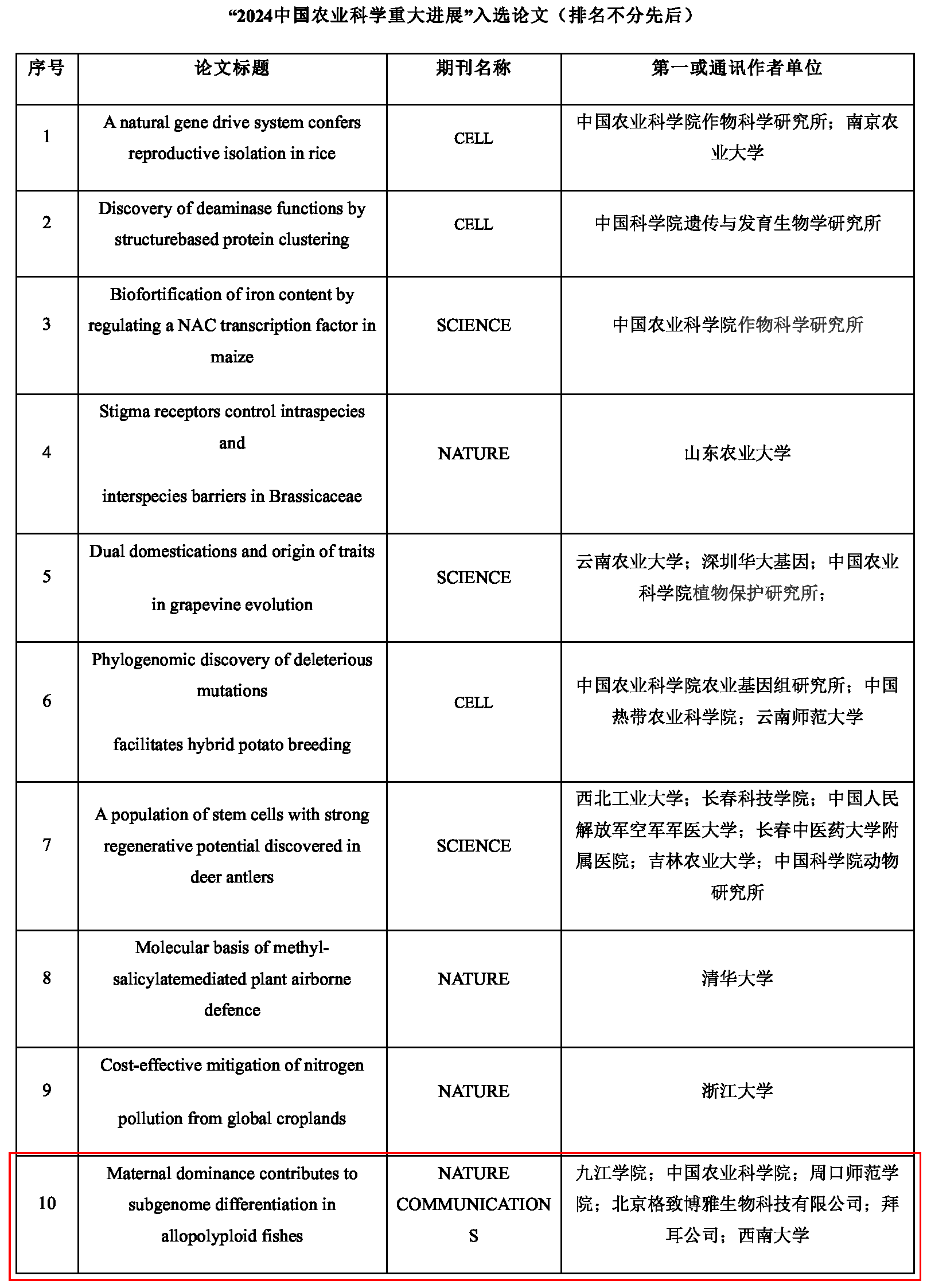 据悉,为了充分展示我国农业科技的原始创新能力,宣传我国农业领域的重大科学成果,并加速推动我国农业科技的高水平自立自强,中国农业科学院组织了这项评选工作。以2023年度Web of Science收录的农业领域中国学者以第一作者或通讯作者发表的2295篇高水平论文为基础,经过初选、专家遴选和院士评审等多轮过程,最终选出10篇重大进展(论文)。