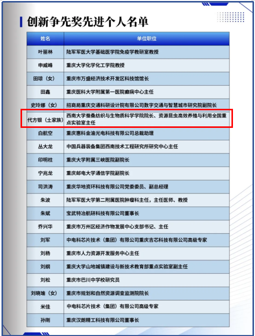 在第九个“全国科技工作者日”前一天,2025年5月29日,重庆市人社局、市科协、市科技局、市国资委在市科技馆联合召开2025年重庆市全国科技工作者日主场活动暨创新争先奖表彰大会。本实验室主任、国家蚕桑产业技术体系首席科学家代方银教授荣获“创新争先奖先进个人”。