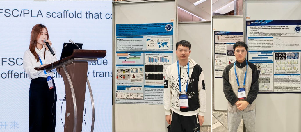 在学术交流环节,博士生张茜作题为 “Osteoimmunity-Regulating Biospun 3D Silk Scaffold for Bone Regeneration in Critical-size Defects” 的口头报告,聚焦骨免疫调控与丝素三维支架的耦合策略,凭借扎实研究与清晰表达,获分论坛“Best Oral Presentation”奖。博士生刘玉隆与朱思宇完成专题墙报展示,围绕蚕丝材料在组织工程与再生医学中的应用探索展开交流。相关工作呈现了我室在蚕丝领域从基础机制研究到工程转化与应用验证的最新进展,受到与会同行广泛关注。