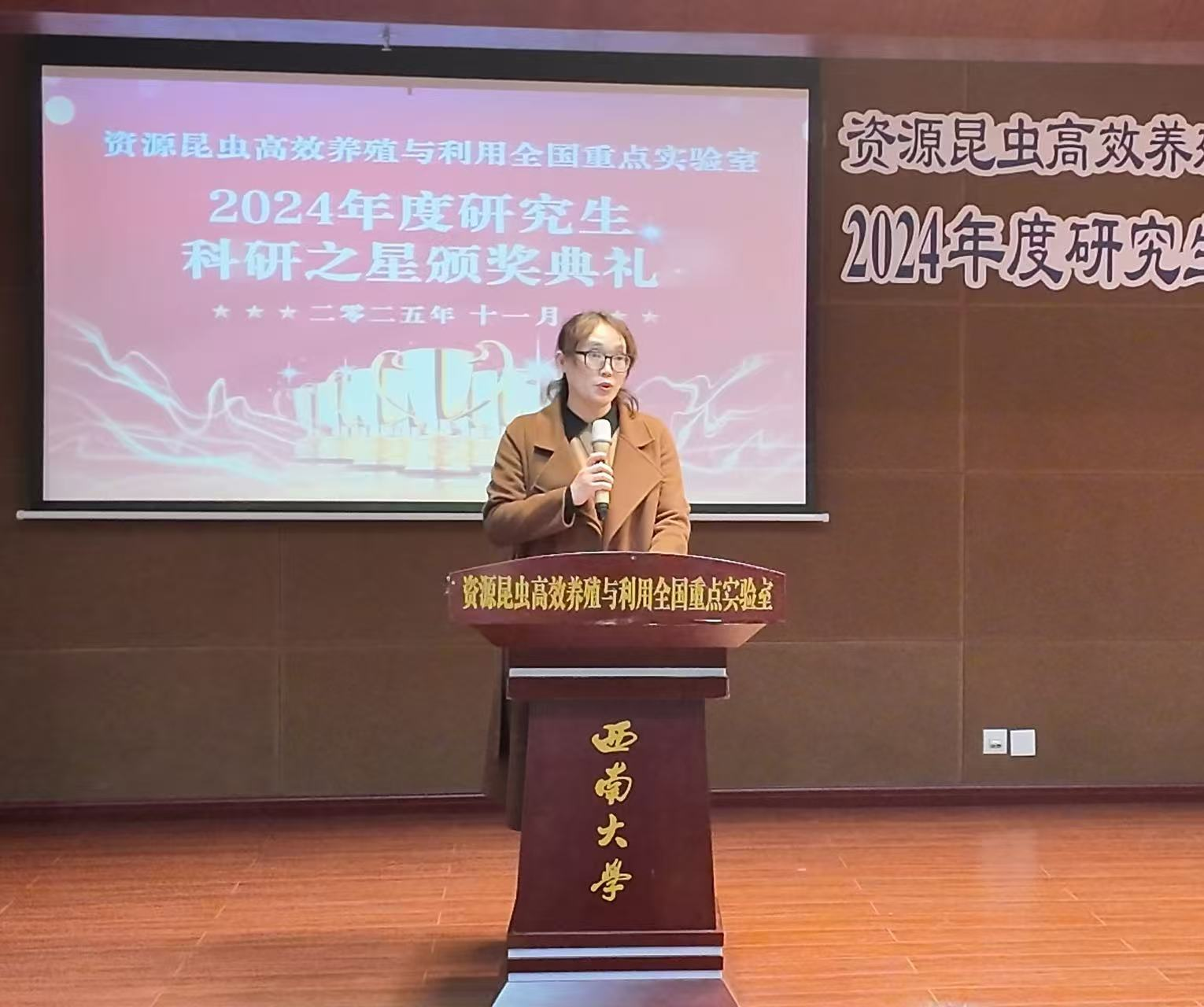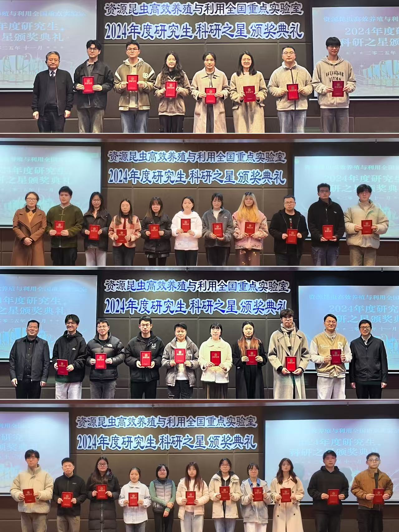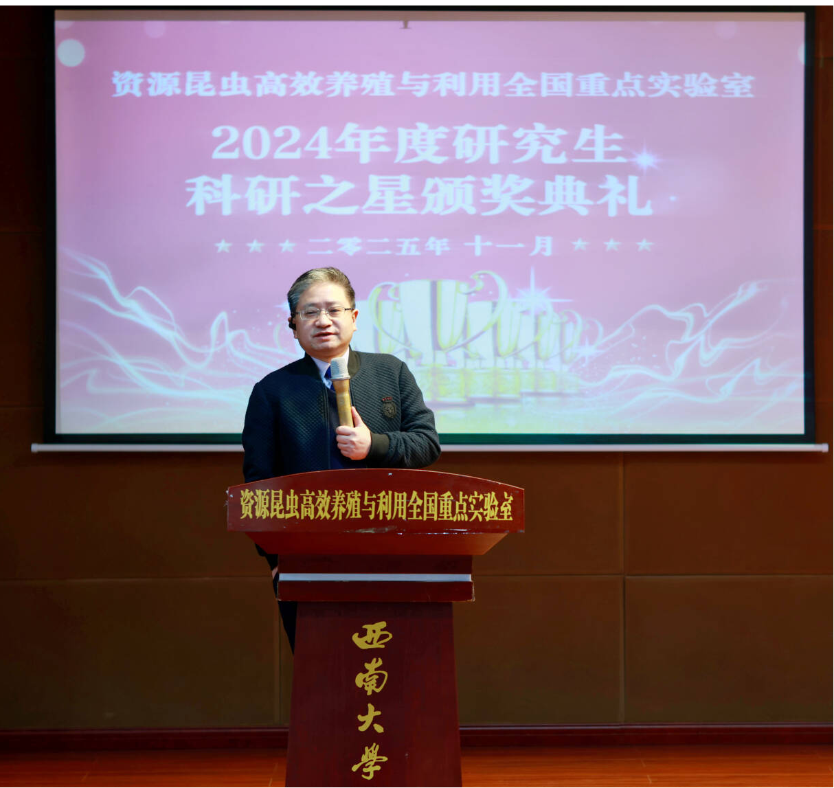 2025年11月25日上午,资源昆虫高效养殖与利用全国重点实验室2024年度研究生“科研之星”颁奖典礼在best365英国在线体育官网蚕学宫一楼报告厅举行。实验室主任代方银,best365英国在线体育官网科学技术发展研究院副院长段有德,蚕桑纺织与生物质科学学院党委书记方凤玲、副书记朱高峰,实验室副主任何宁佳、程廷才、李田等出席典礼。“科研之星”获奖研究生、指导教师及实验室师生代表共同参加。颁奖典礼由程廷才副主任主持。