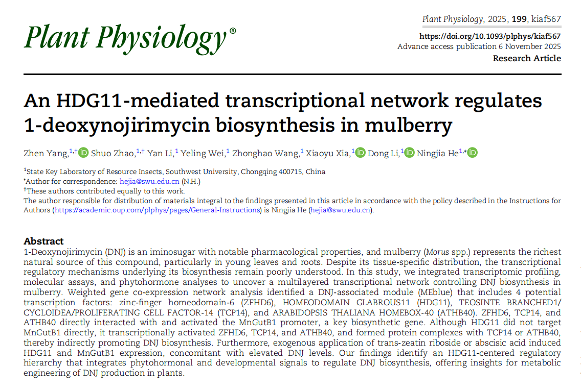 近日,资源昆虫高效养殖与利用全国重点实验室何宁佳团队在桑树特色活性成分1-脱氧野尻霉素(1-deoxynojirimycinDNJ)的生物合成调控研究方面取得重要进展,在中科院期刊分区一区TOP期刊Plant Physiology杂志上以An HDG11-mediated transcriptional network regulates 1-deoxynojirimycin biosynthesis in mulberry”为题发表研究论文。该研究首次成功构建并解析了一个以转录因子HDG11为核心、整合细胞分裂素tZR与脱落酸ABA信号的多层级转录调控网络,系统揭示了桑树DNJ生物合成的关键调控机制,为提升DNJ产量、创制高附加值天然药用资源提供了新的理论支撑和应用方向。