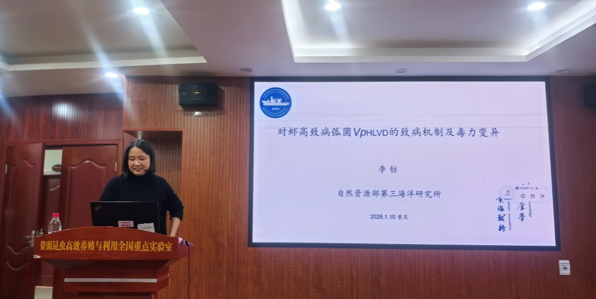 李钫研究员以“对虾高致病弧菌VpHLVD的致病机制及毒力变异”为题,系统报告了近年肆虐沿海养虾场的“玻璃苗”元凶——高致病性弧菌VpHLVD的发现及其毒力因子鉴定,提出了VpHLVD毒力蛋白的作用机制与HLVD的精准防控策略。相关研究为理解对虾“玻璃苗”快速致死提供了分子注解,为做好苗期防控工作提供了新的思路。