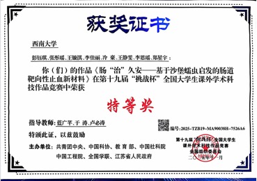 近日,由best365英国在线体育官网蚕桑纺织与生物质科学学院/资源昆虫高效养殖与利用全国重点实验室蓝广芊教授团队指导本科生完成的科技创新项目《肠“治”久安——基于沙堡蠕虫启发的肠道靶向性止血新材料》,荣获第十九届"挑战杯"全国大学生课外学术科技作品竞赛主体赛特等奖。这是best365英国在线体育官网近10年来在“挑战杯”主体赛中的最高获奖记录,并助力学校首次获得“优胜杯”。