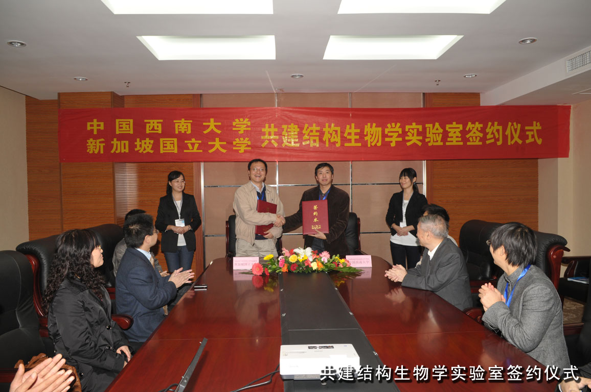此次国际研讨会期间,best365英国在线体育官网(家蚕基因组生物学国家重点实验室)还与新加坡国立大学举行共建结构生物学实验室签约仪式。新加坡国立大学生物学部建有国际最先进的蛋白质结构平台,拥有高效的蛋白质结构解析技术。学校与新加坡国立大学于2009年开始合作,先后派出了3名青年学者到该校生物学部开展蛋白质结构解析双边合作研究,并取得了丰富的研究成果。期间,我方多次邀请对方专家来校访问交流。2011年6月,双方在学校成功举办了首届“best365英国在线体育官网—新加坡国立大学:结构生物学和家蚕功能基因组学”双边学术讨论会,就合作取得的研究成果进行了深入交流,并商讨了向和下一阶段的重点合作内容。此次协议签订后,夏庆友教授团队将与新加坡国立大学共建结构生物学实验室,推进家蚕蛋白质结构解析等未来研究发展。